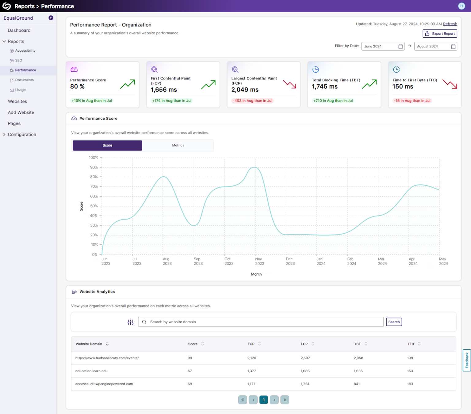 Slow-loading content can quickly cause users to lose interest in websites. To enhance user experience, EqualGround offers a comprehensive performance report that evaluates the key speed metrics below, allowing ongoing analysis to maintain or improve performance over time.