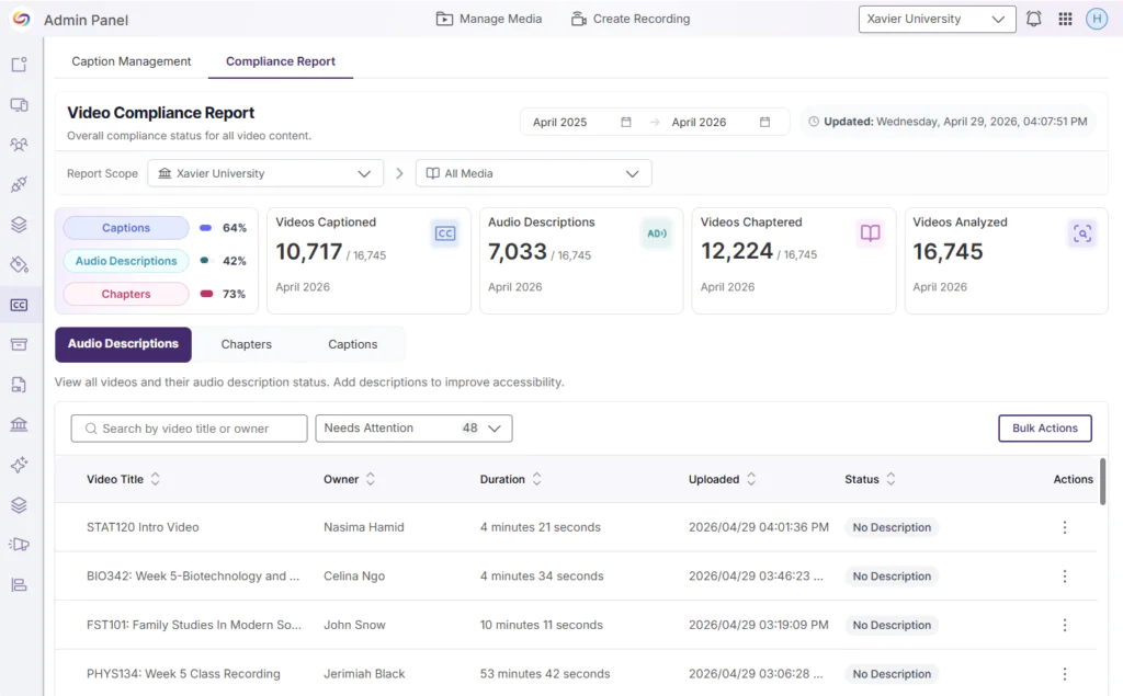 Instructors can now request human-generated Enhanced Audio Descriptions through their existing 3Play Media integration, providing professional-quality accessibility content within 24 hours. This feature expands audio description options beyond AI-generated content to ensure the highest quality accessibility standards for critical video materials.