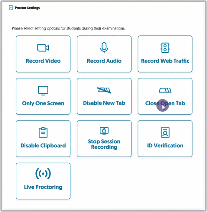 We have updated the UI to provide a modern look for instructors and optimized how they view and interact with settings. By introducing an intuitive button layout, we have made it simple for instructors to navigate through all proctor settings with ease. With a few clicks, instructors can effortlessly apply desired settings to their proctored tests.