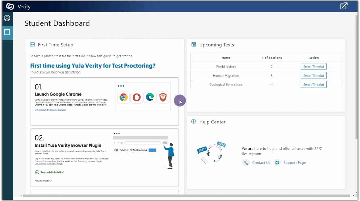Building upon our previous update for the instructor dashboard, the Live-Proctoring Dashboard for students provides steps to authenticate themselves for test sessions and a dynamic panel showcasing upcoming live tests. Students can easily register for upcoming sessions by selecting their preferred timeslot before the start of the test.
