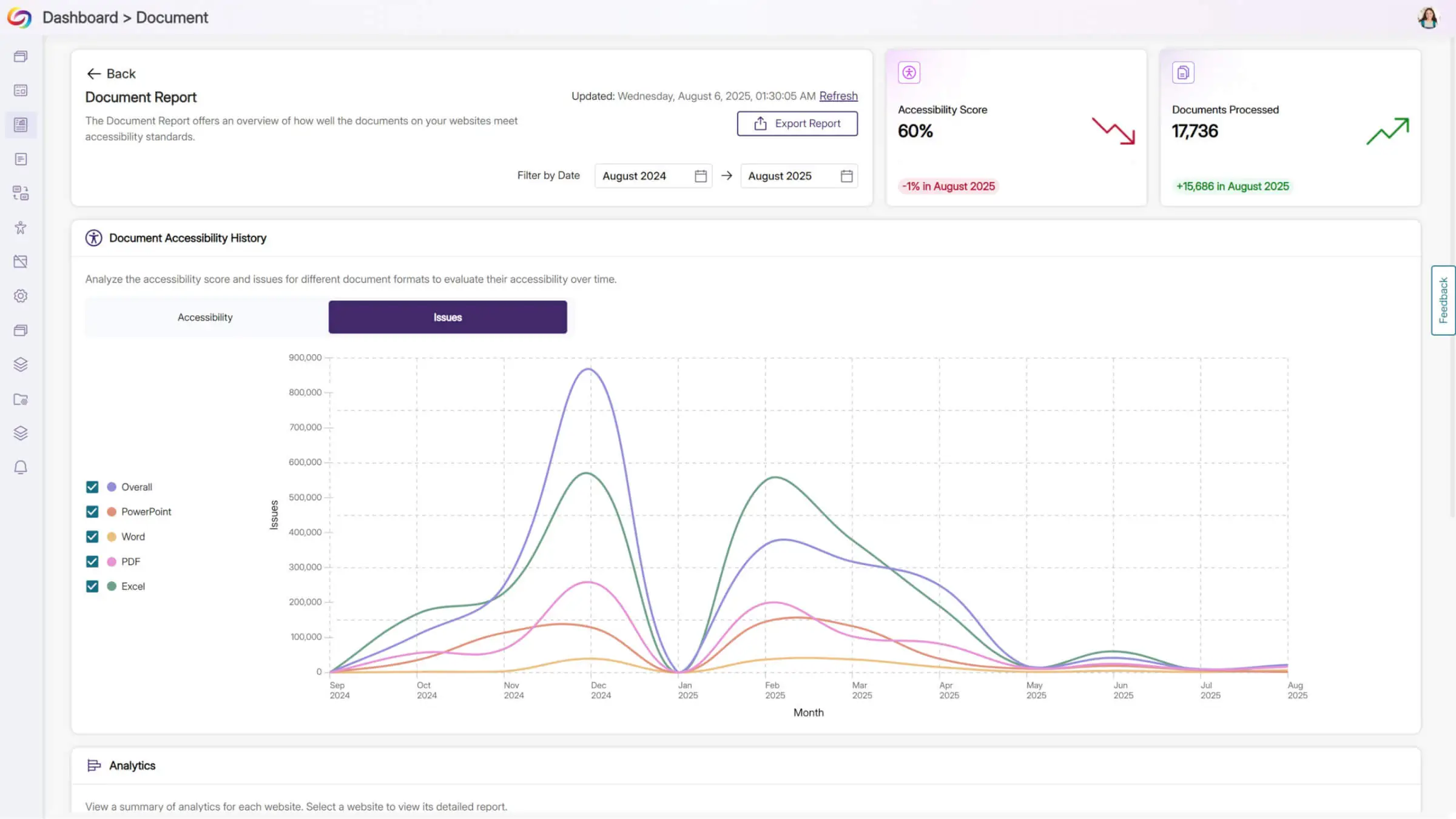 Make smarter, data-driven decisions with dynamic reports for overall scores, or filtered by ARIA or WCAG compliance levels, issues types, and more. High-level reports include clear explanations and direct links to in-depth resources so issues can be understood and resolved faster.