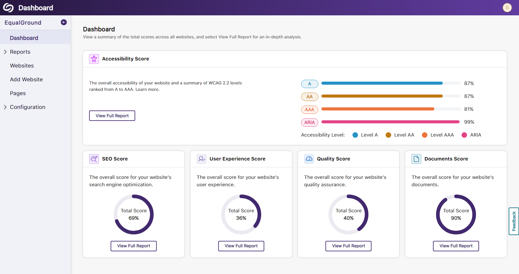 Gain holistic insights on your web accessibility with YuJa EqualGround’s integrated accessibility reporting. The unified dashboard provides both webpage and organizational-level accessibility scores, enabling a quick assessment and targeted improvements across your digital ecosystem.