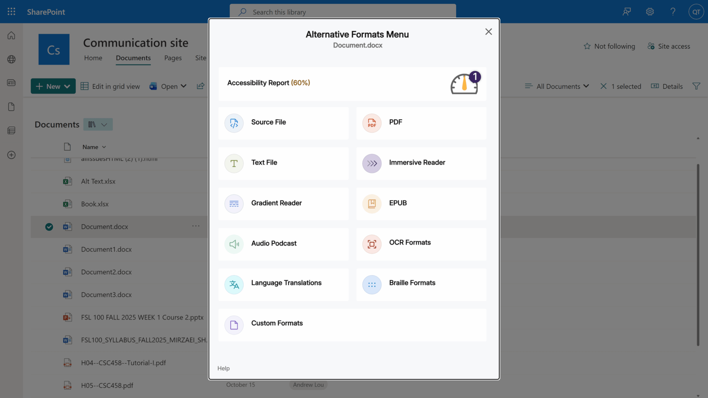 Generate and access alternative formats for SharePoint documents without leaving the platform. Create audio, ePUB, Braille, HTML, tagged PDF, plain text, and more, to give users the options they need to meet their accessibility needs