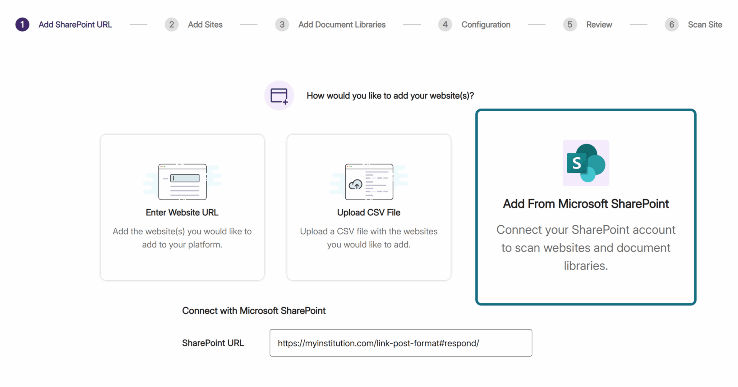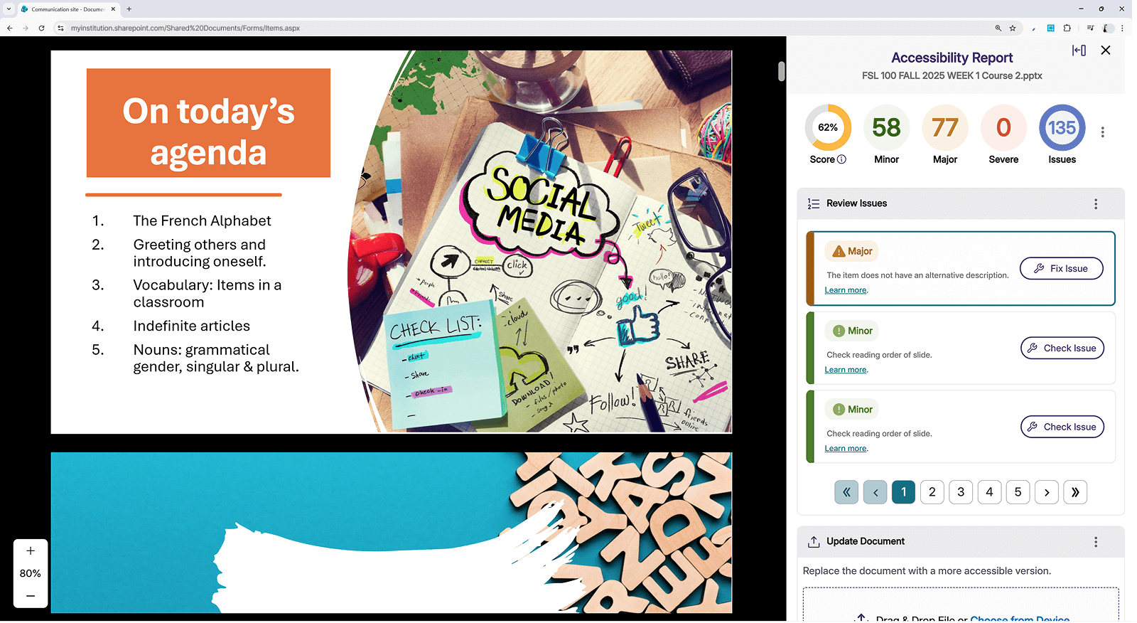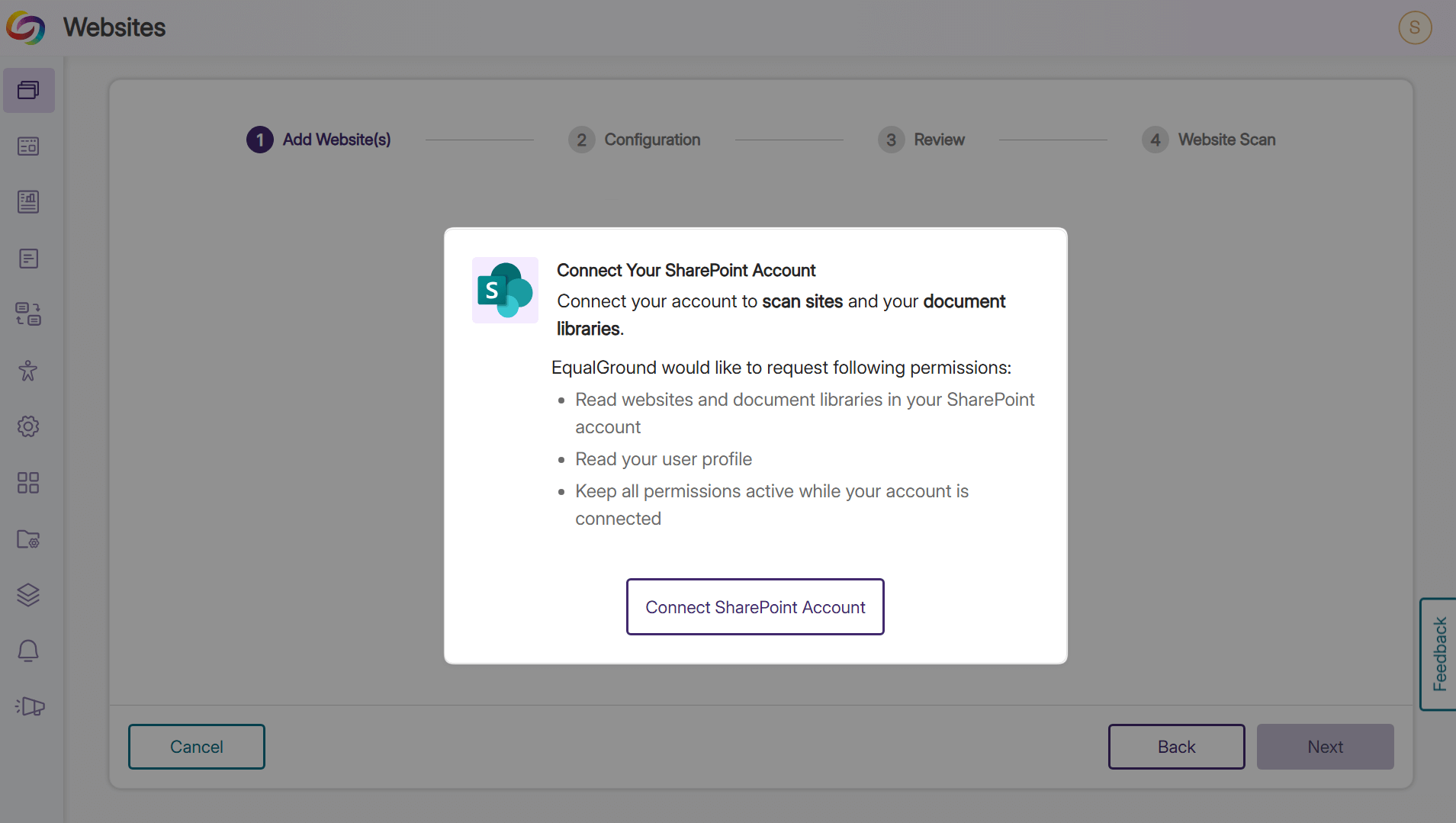 Connect YuJa EqualGround to your SharePoint environment with a simple one-time setup. Add multiple SharePoint sites and document libraries under the same Microsoft account, eliminating the need to approve each site individually and allowing you to focus on accessibility fixes rather than administrative tasks.