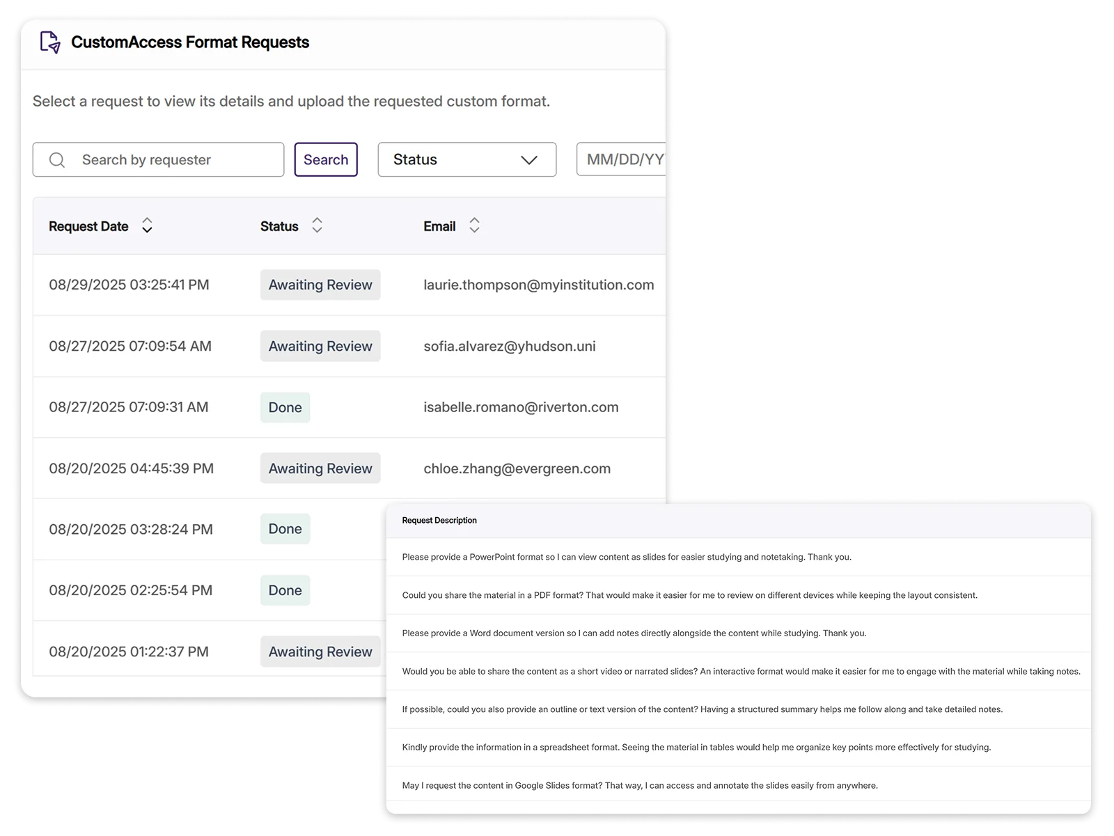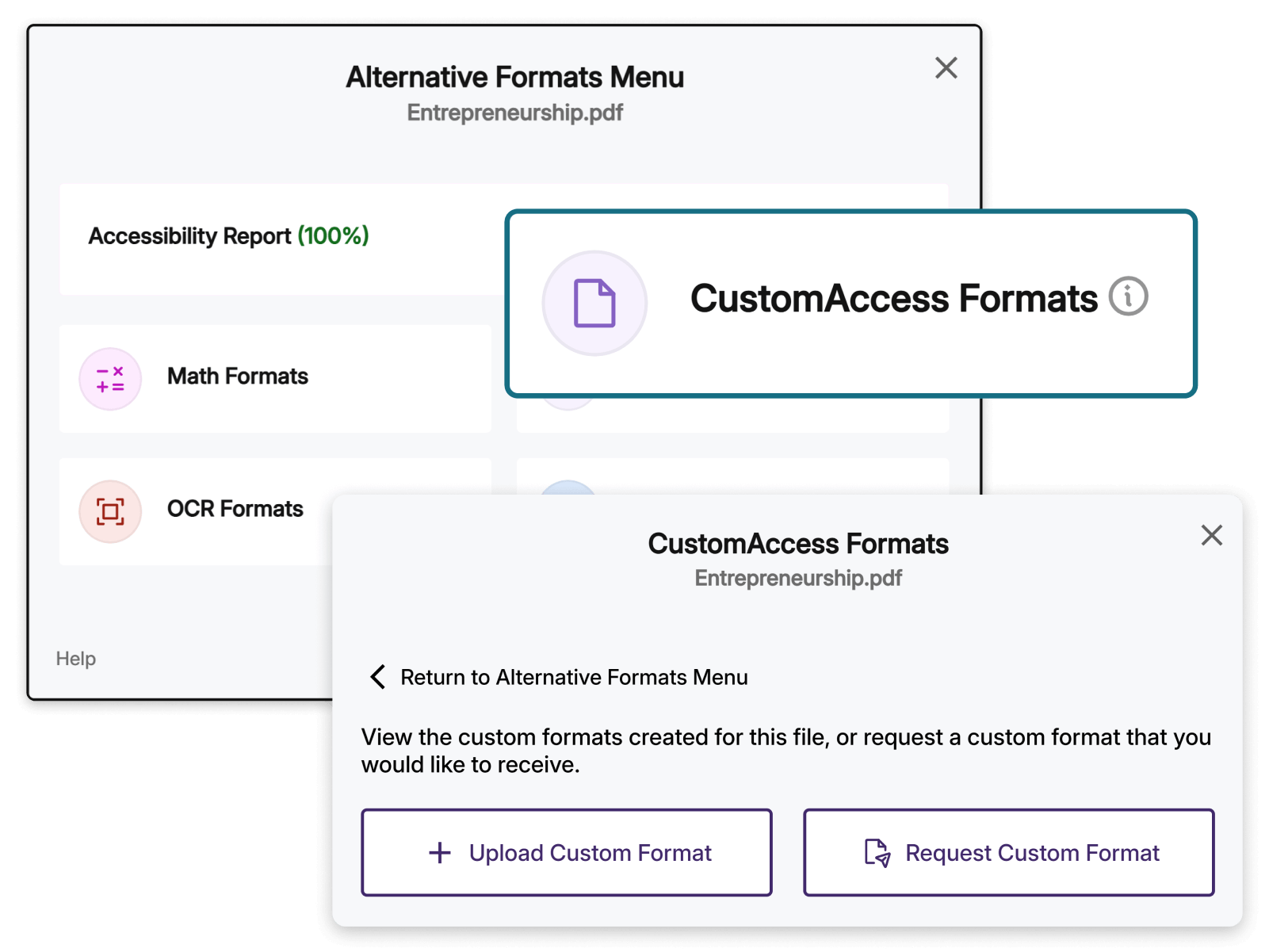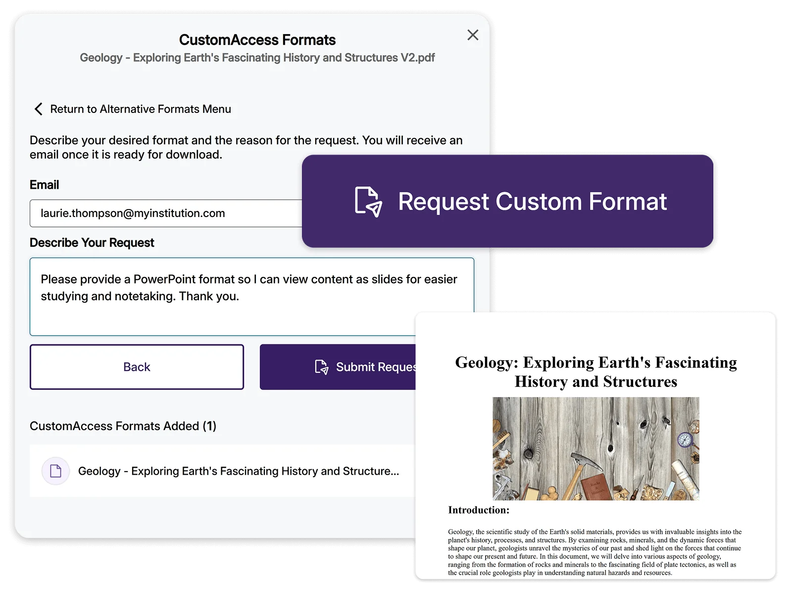 Allow your students to submit individual format requests with the built-in “Custom Format” option, giving them an easy way to select alternative formats, send their request directly through YuJa Panorama, and receive results automatically in their inbox.