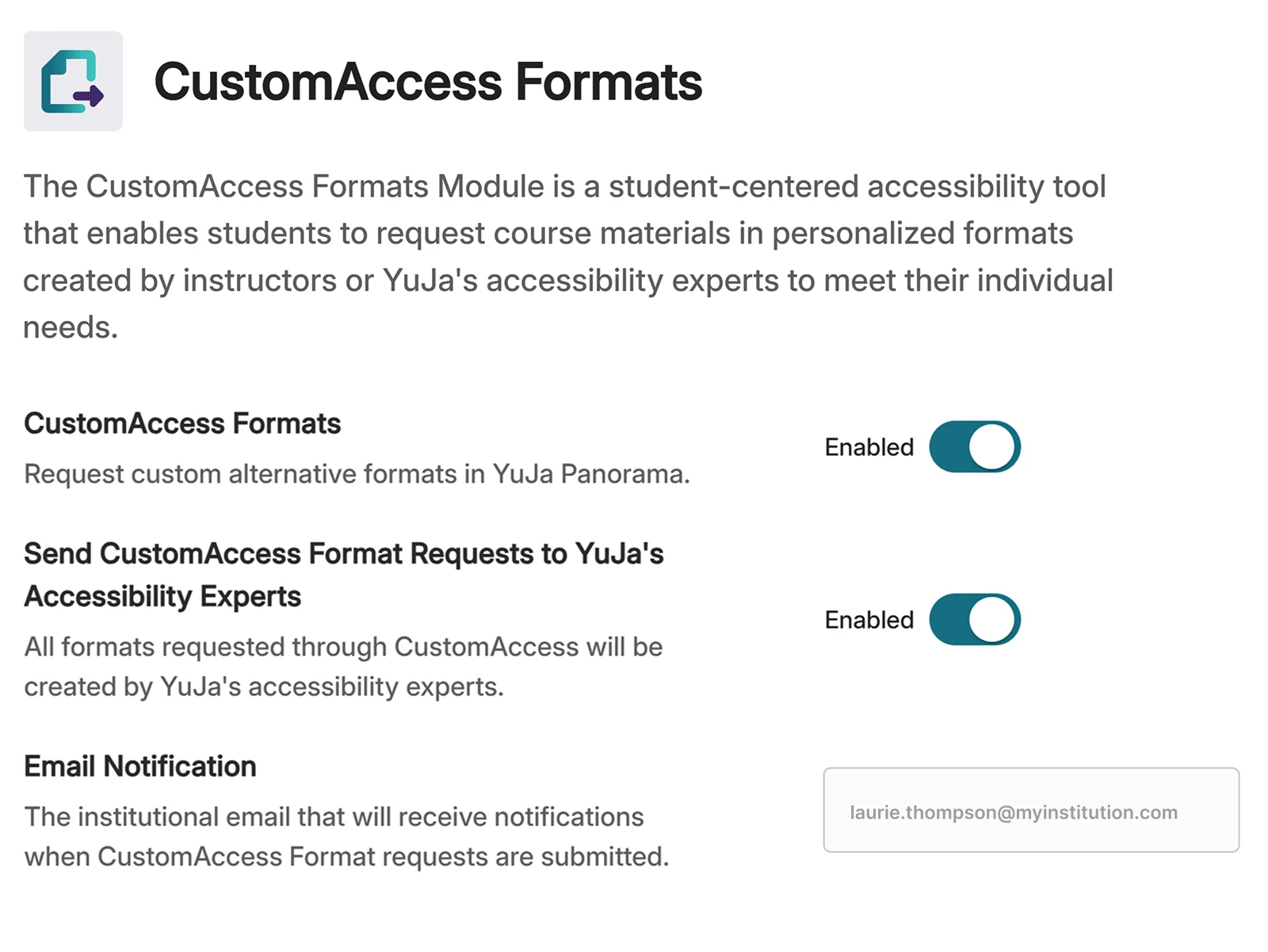 The YuJa DocAssist Accessibility Module allows students with accessibility needs to request custom alternative formats.