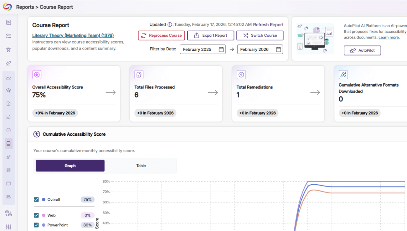 Gain actionable insights into accessibility with YuJa Panorama’s reporting tools. Administrators can filter by sub-account, department, or term, providing clear visibility into scores, usage patterns, and areas for improvement. Targeted reporting ensures that your institution can track and enhance its accessibility progress.