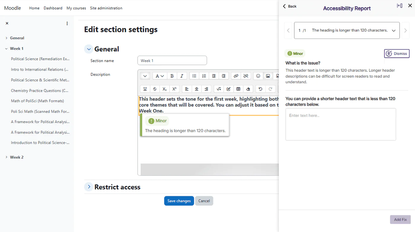Within Moodle, YuJa Panorama offers instant feedback on content accessibility, empowering instructors to correct issues immediately. Content developed in the HTML WYSIWYG Editor is reviewed and scored to help ensure it aligns with established accessibility standards.