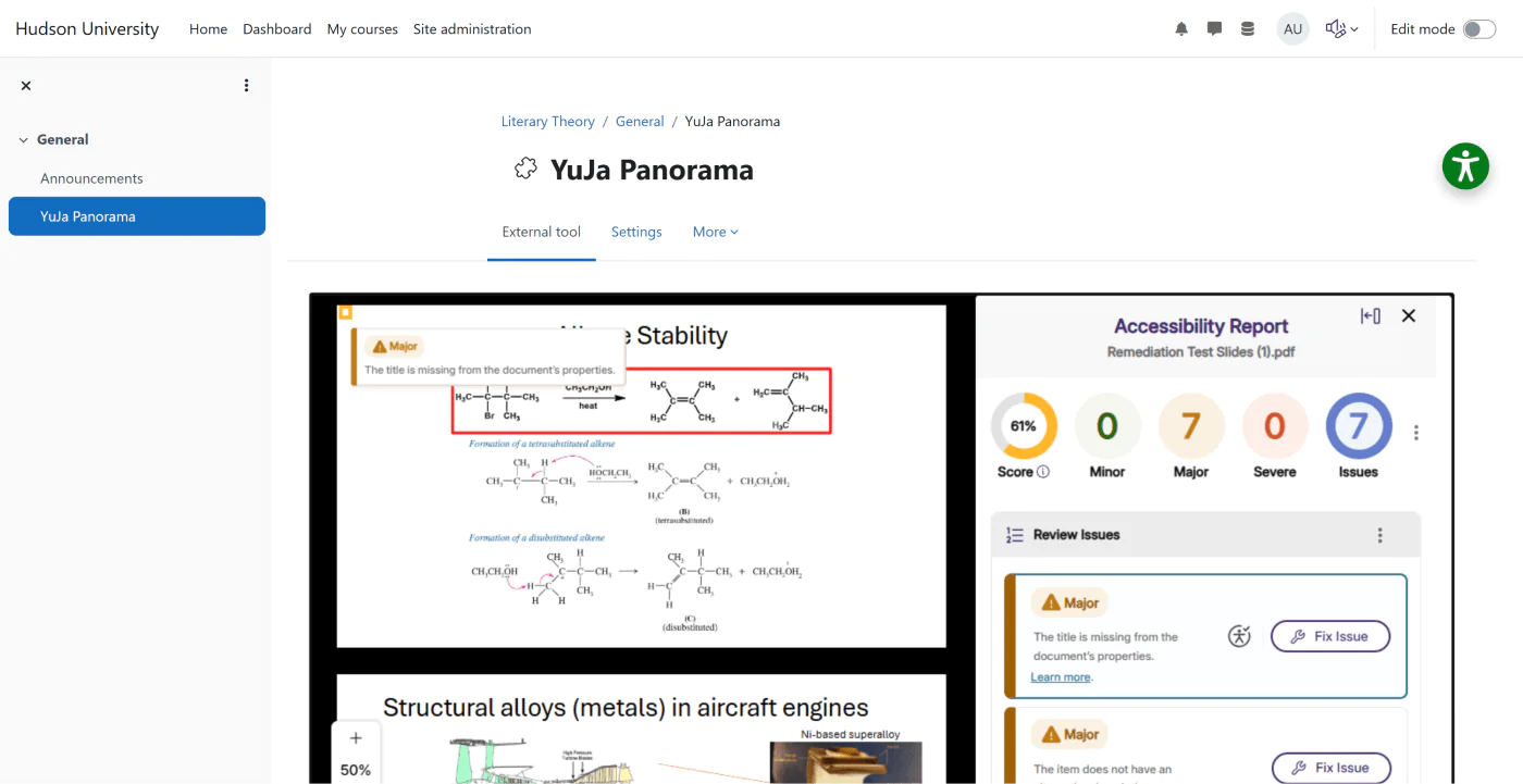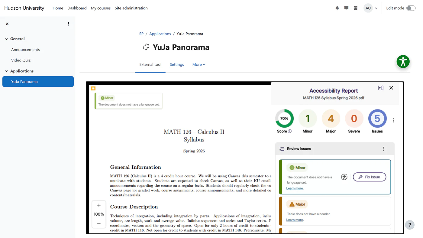 YuJa Panorama analyzes uploaded files in Moodle, providing actionable insights, suggested fixes, and instant remediation tools. Faculty can customize reporting, generate over 20 alternative formats, and update course materials in place to improve accessibility throughout their Moodle course.