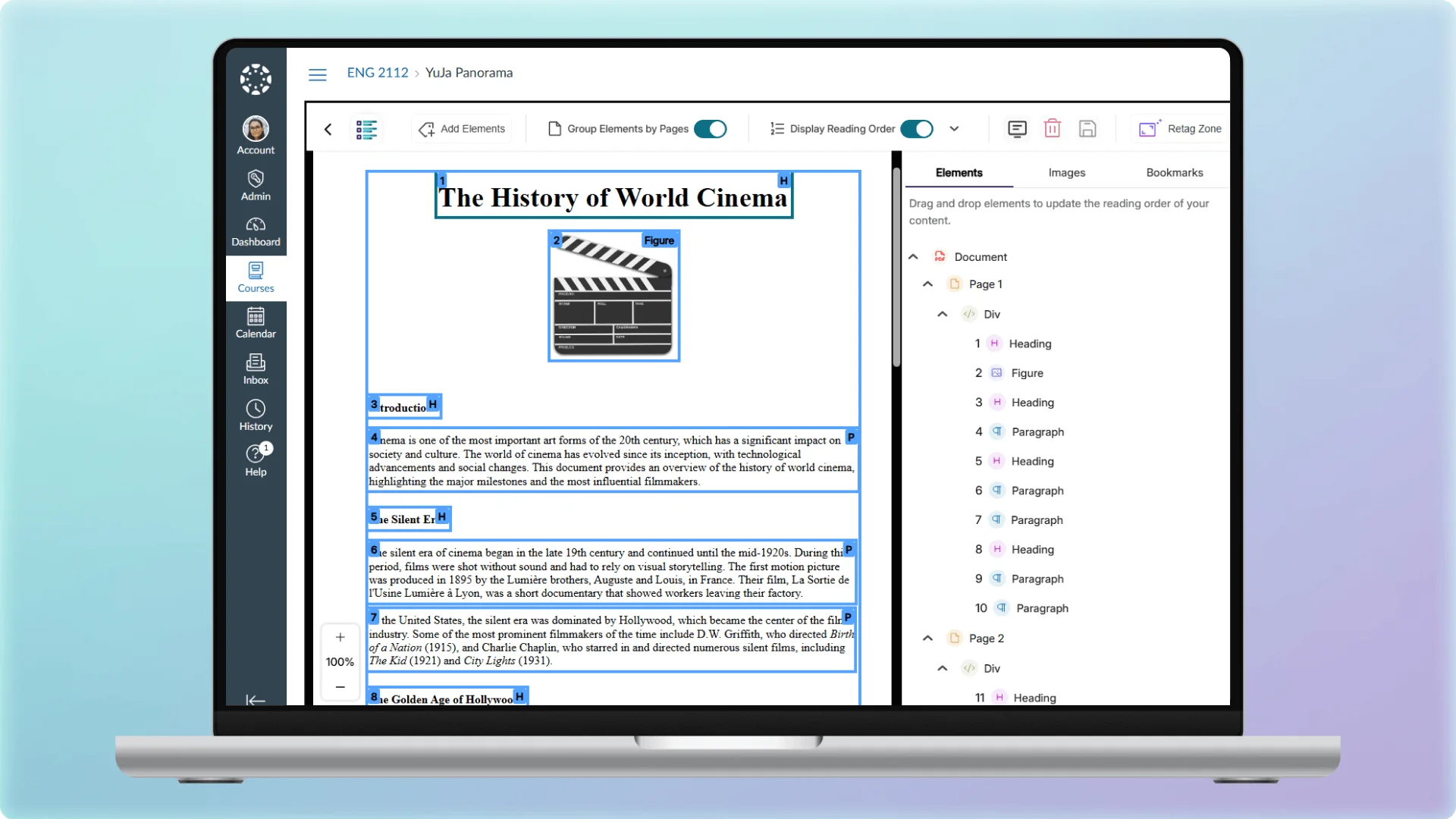 Logical structure supports the accessibility of documents to users with disabilities. With the YuJa Remediation Max Engine, users can organize a document’s structure with chapters, headings, paragraphs and sections of special elements like figures, tables, and footnotes.