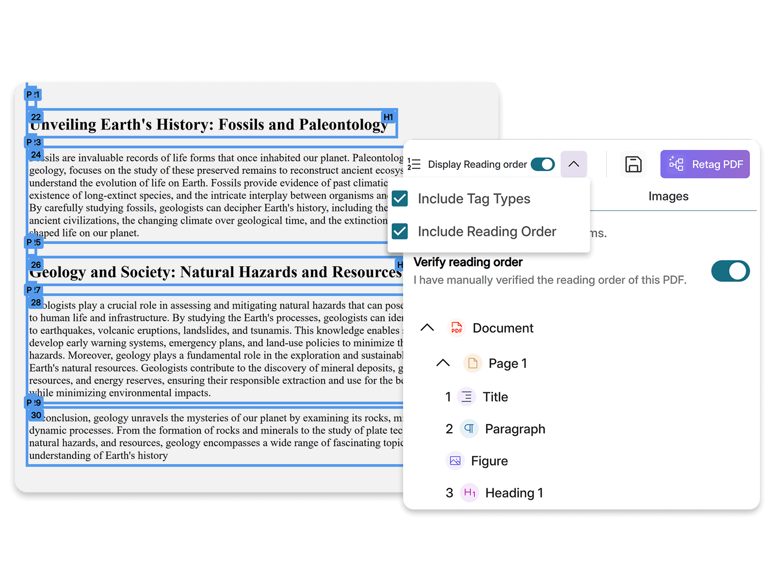 Adds proper structural tags to PDFs, making documents fully navigable and accessible to assistive technologies.