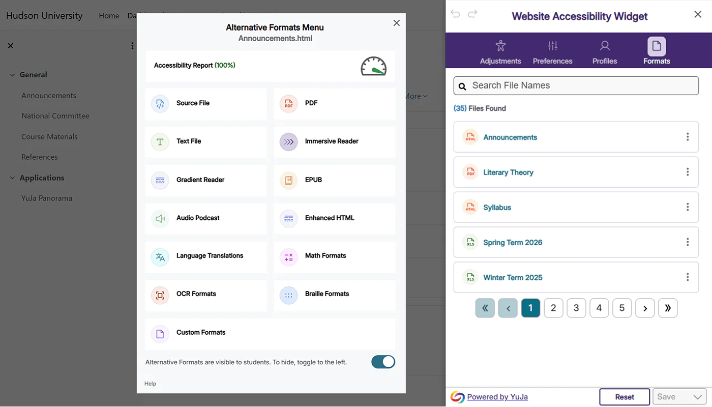 Website Accessibility automatically scans for documents and generates accessible alternatives. Users can set their language and generate alternative formats to files, from high contrast, to text-to-speech, EPUB, Braille, and more. YuJa Panorama supports doc, docx, ppt, pptx, html, and pdf files.