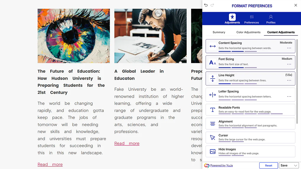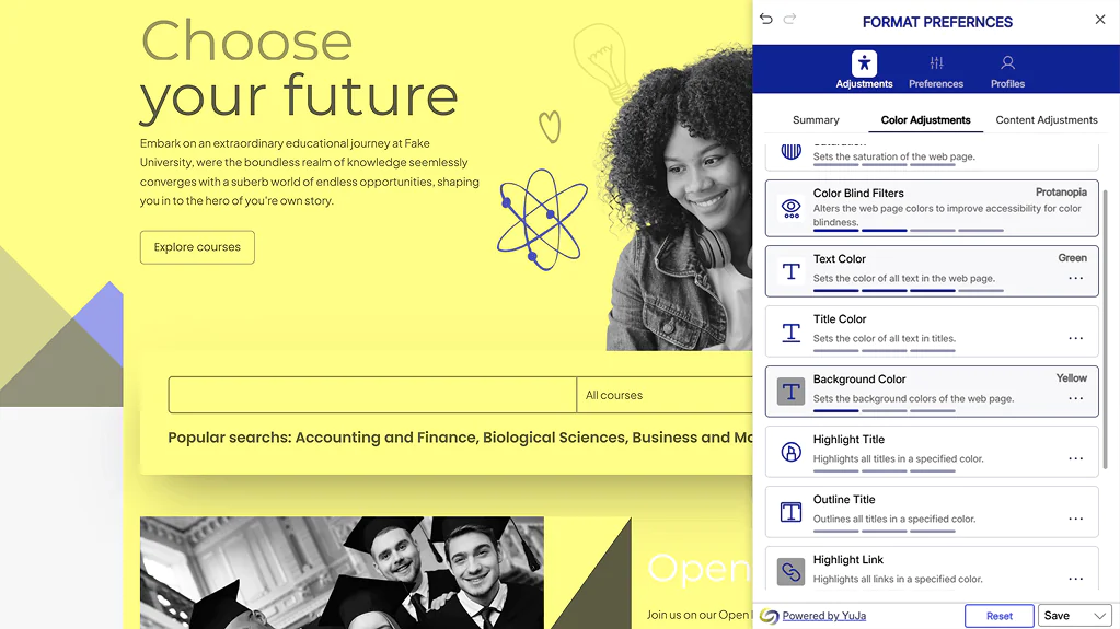 Colors need contrast for web accessibility. To help those with low contrast sensitivity or those who cannot distinguish between certain colors, YuJa Panorama enables users to manually adjust elements like contrast, saturation, text colors, background colors and more. Users can also create a unique profile and save it for future use on all web pages they visit.