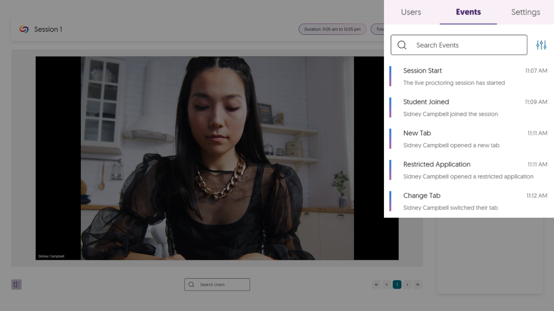 During a live assessment, the Events log will provide proctors with a list of flagged restrictions that have occurred for each user in real time. Proctors can use this information to immediately view a user’s environment and create any notes regarding the flagged restriction.