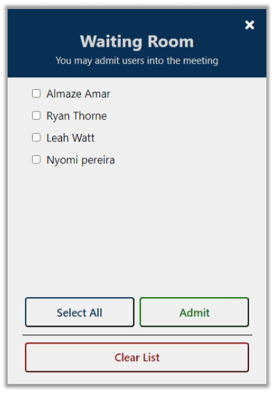 Previously, the Waiting Room was only active until the moment the Meeting Owner joined a meeting. In an effort to make the Waiting Room more dynamic and provide Meeting Owners with the power to manage the Waiting Room. They now have the option to let in users on an individual basis or all at once. They also have the ability to delegate this responsibility to an admitted user.