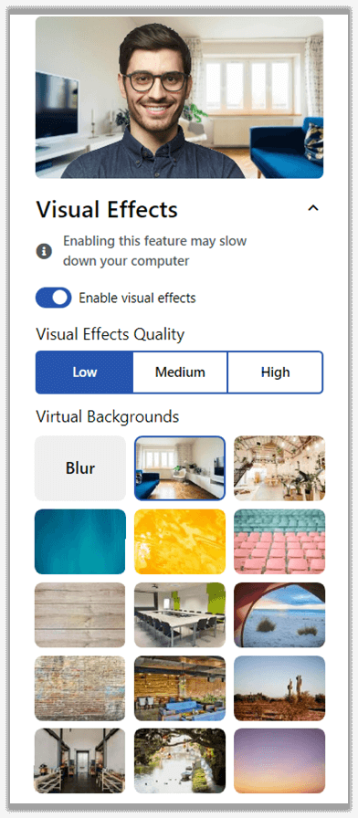 Virtual Backgrounds can be used to create a sense organization when participating in a Video Conference. With real time technology, Meeting Owners and all participants can utilize Visual Effects, choosing between various virtual backgrounds to utilize. In future releases, we look to optimize the Visual Effects so they can efficiently run on all hardware setups. To learn more about this feature, please click here.