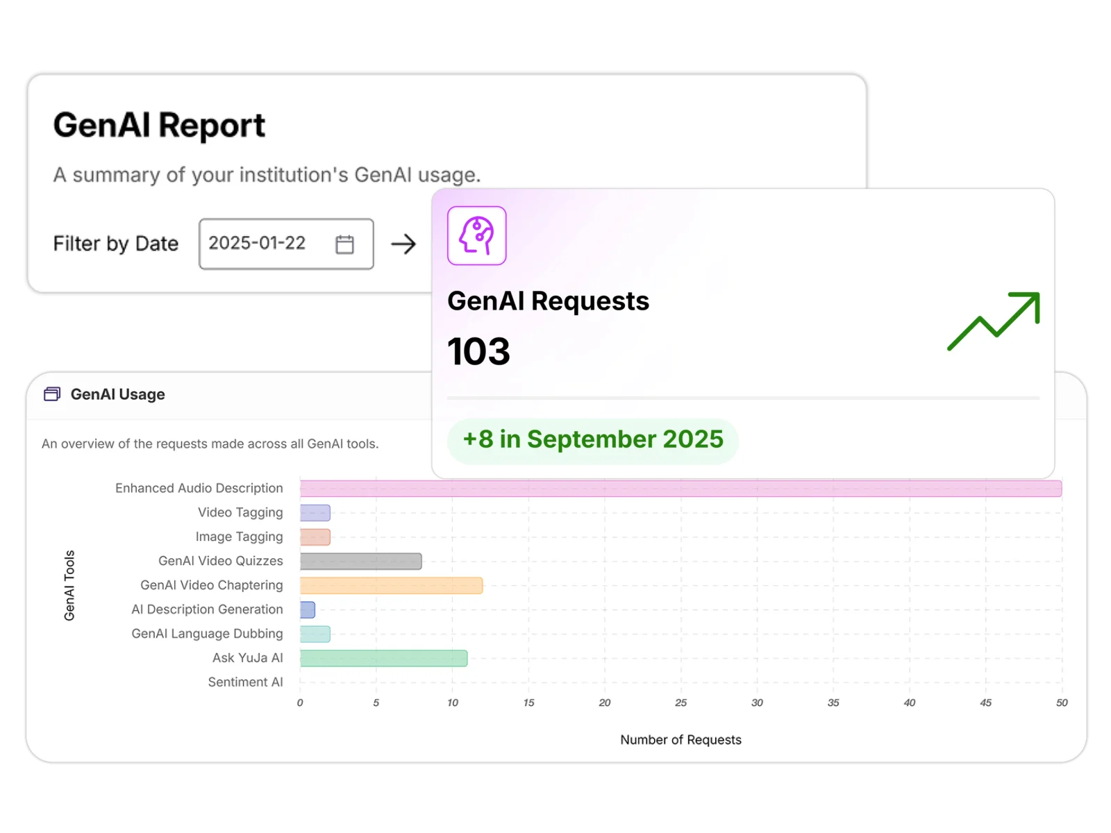 The YuJa GenAI Usage Report helps you track your institution’s GenAI usage across all GenAI tools. You can quickly review the status of each request and keep track of your credits.