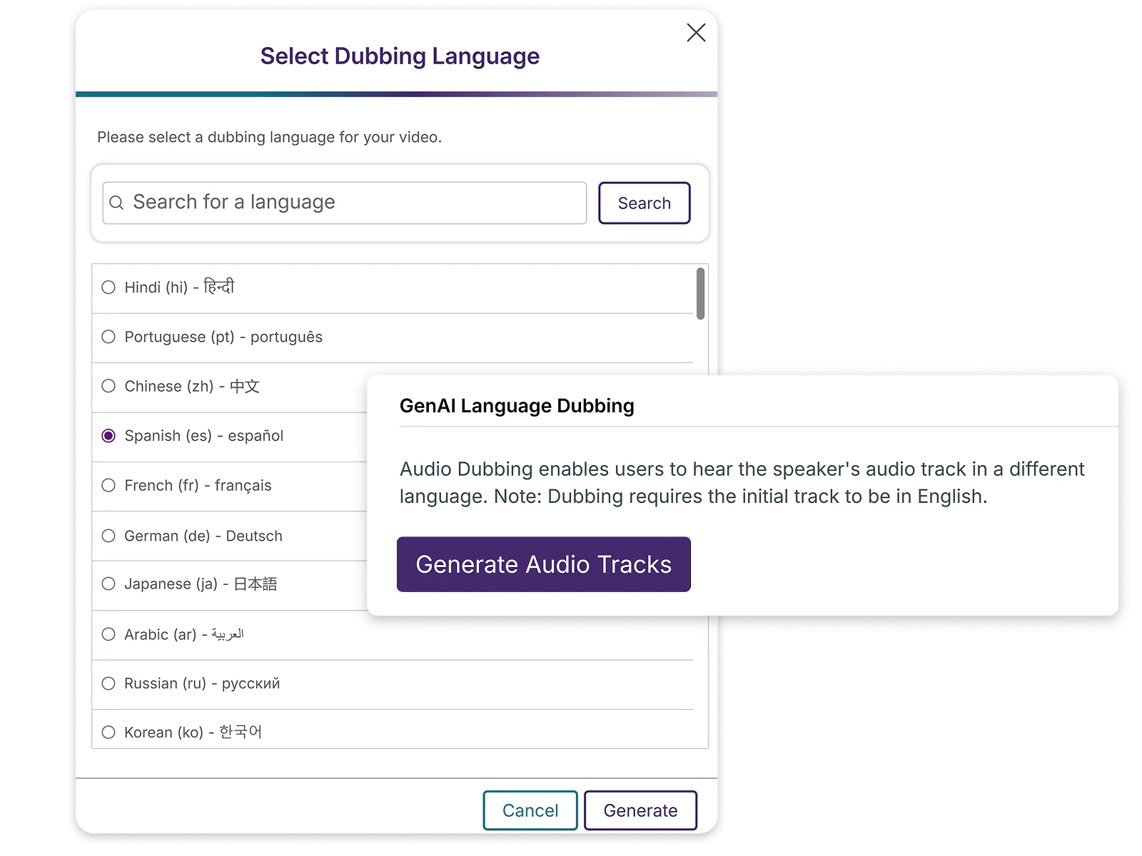 Instantly generate audio tracks in 25+ languages. Just choose the target language and AI creates new versions that appear alongside your original video, making your content accessible to diverse audiences everywhere.