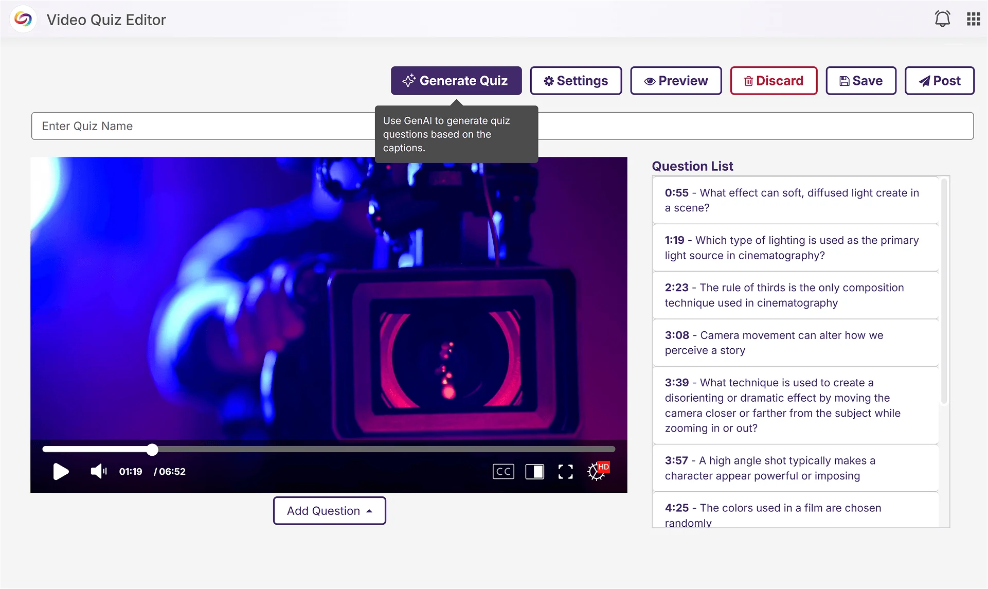 Save hours of manual work with YuJa GenAI Video Quizzes, which lets you generate and embed quizzes into your videos. With a single click, the tool analyzes your videos, auto-generates and embeds relevant, thoughtful quiz questions at the right time to keep learners engaged and reinforce concepts.