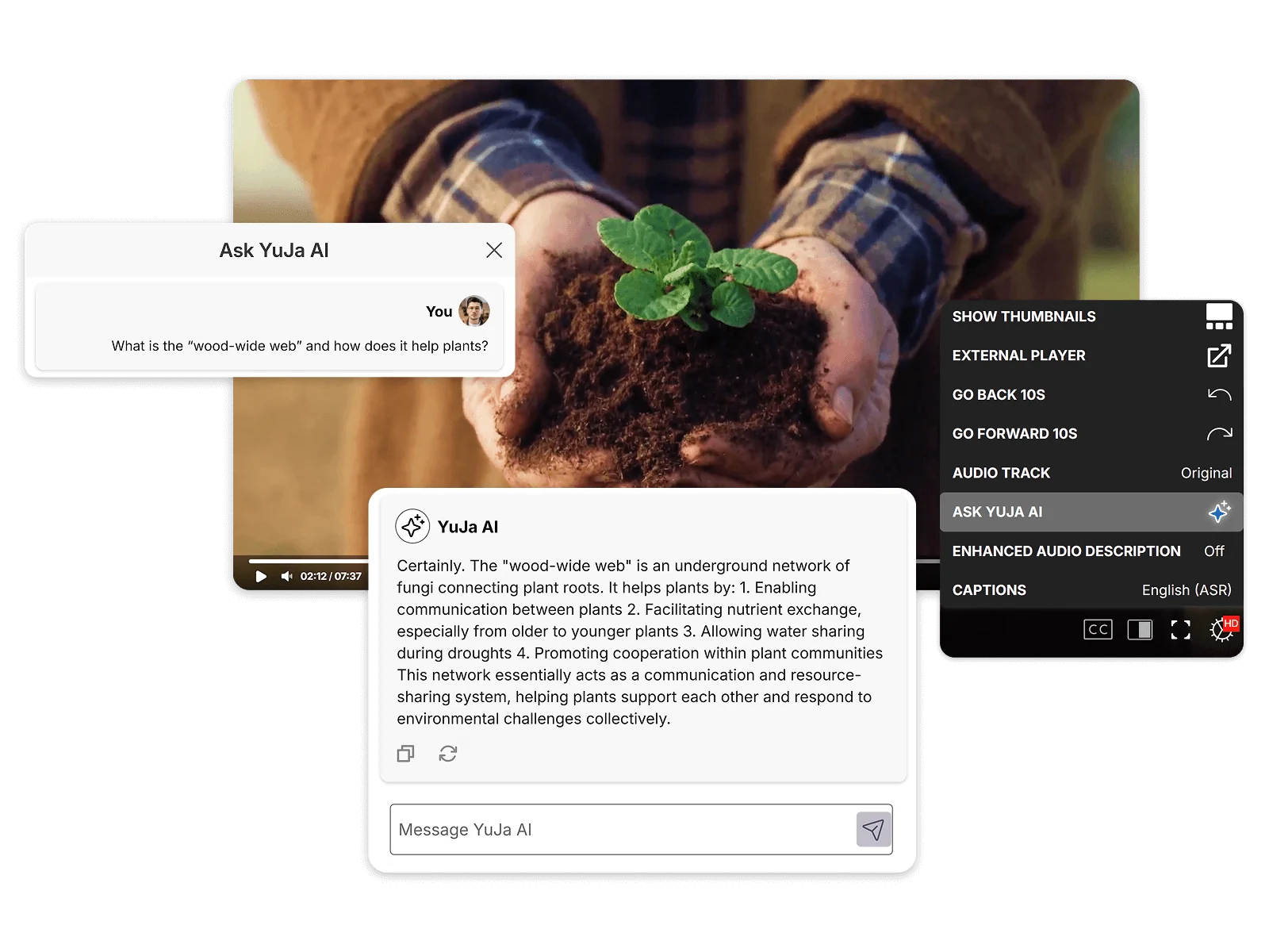 The GenAI Video PowerPack’s AI agents transform videos into accessible learning tools. Automate audio descriptions for Title II compliance, create interactive Q&A during playback, generate multilingual versions, and enhance video navigation, all directly from your YuJa Lumina Video Platform interface. Designed to save time and simplify complex workflows, the YuJa GenAI Video PowerPack makes it easy to deliver more inclusive, interactive, and engaging video experiences.